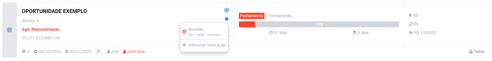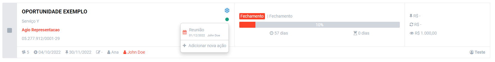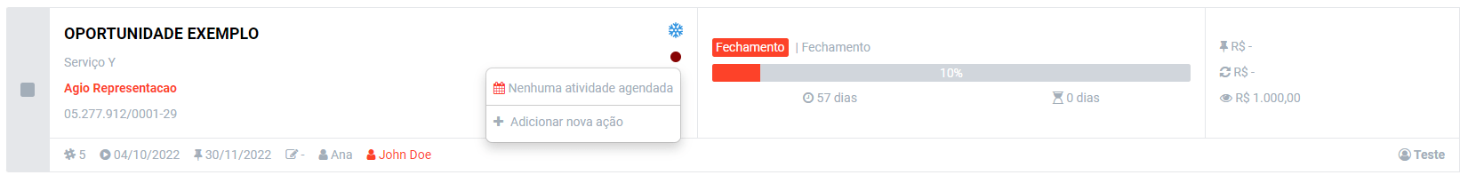 Com essa funcionalidade você pode, de maneira facilitada, visualizar quando uma oportunidade possui uma agenda planejada, finalizada, atrasada ou não possui nenhuma agenda.