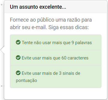 - No campo Assunto damos algumas dicas para ter mais sucesso na taxa de abertura. Ah, e um bom copywriting (escrita persuasiva) aumenta sua taxa de abertura, então use e abuse da criatividade para chamar atenção ao seu conteúdo! ✌?