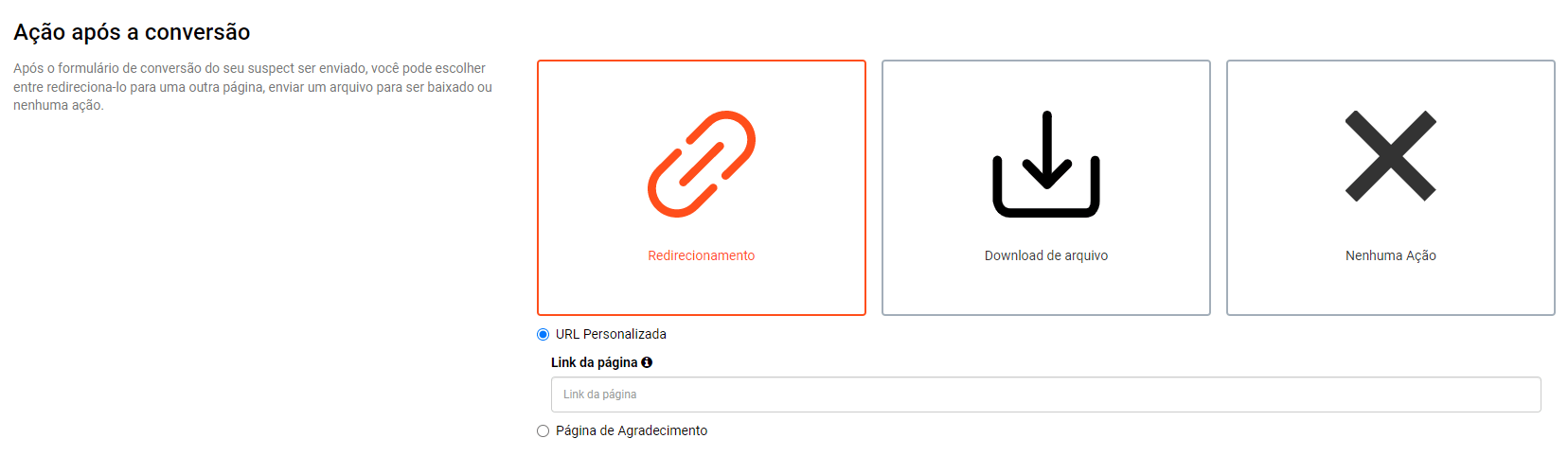 Redirecionamento: Vai redirecionar o visitante para outra página – uma URL personalizada ou uma Página de Agradecimento.