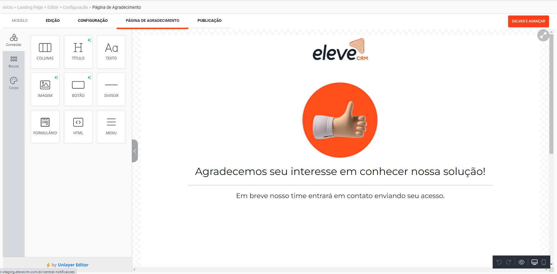 Ao definir como uma Página de Agradecimento, uma nova guia de edição irá abrir para você criar sua nova página. O esquema de edição é o mesmo realizado anteriormente para criar a landing page.