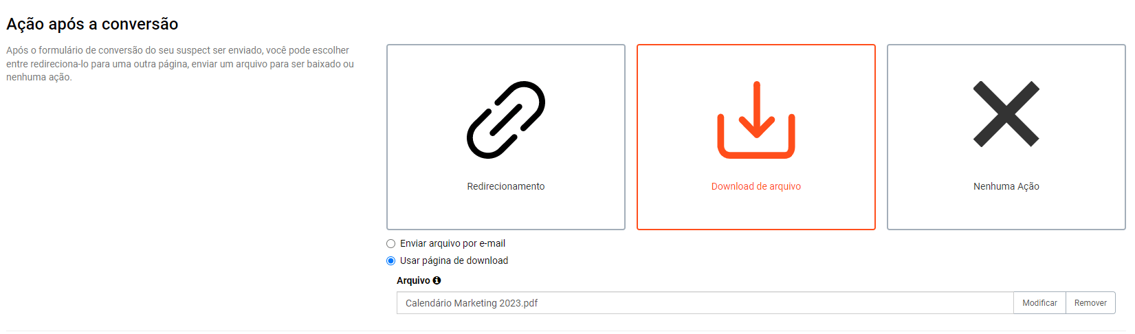 Download de arquivo: Caso você esteja publicando uma landing page para baixar um ebook, por exemplo, você pode colocar o arquivo para fazer download automaticamente após o preenchimento e envio do formulário, ou enviar o arquivo por e-mail.
