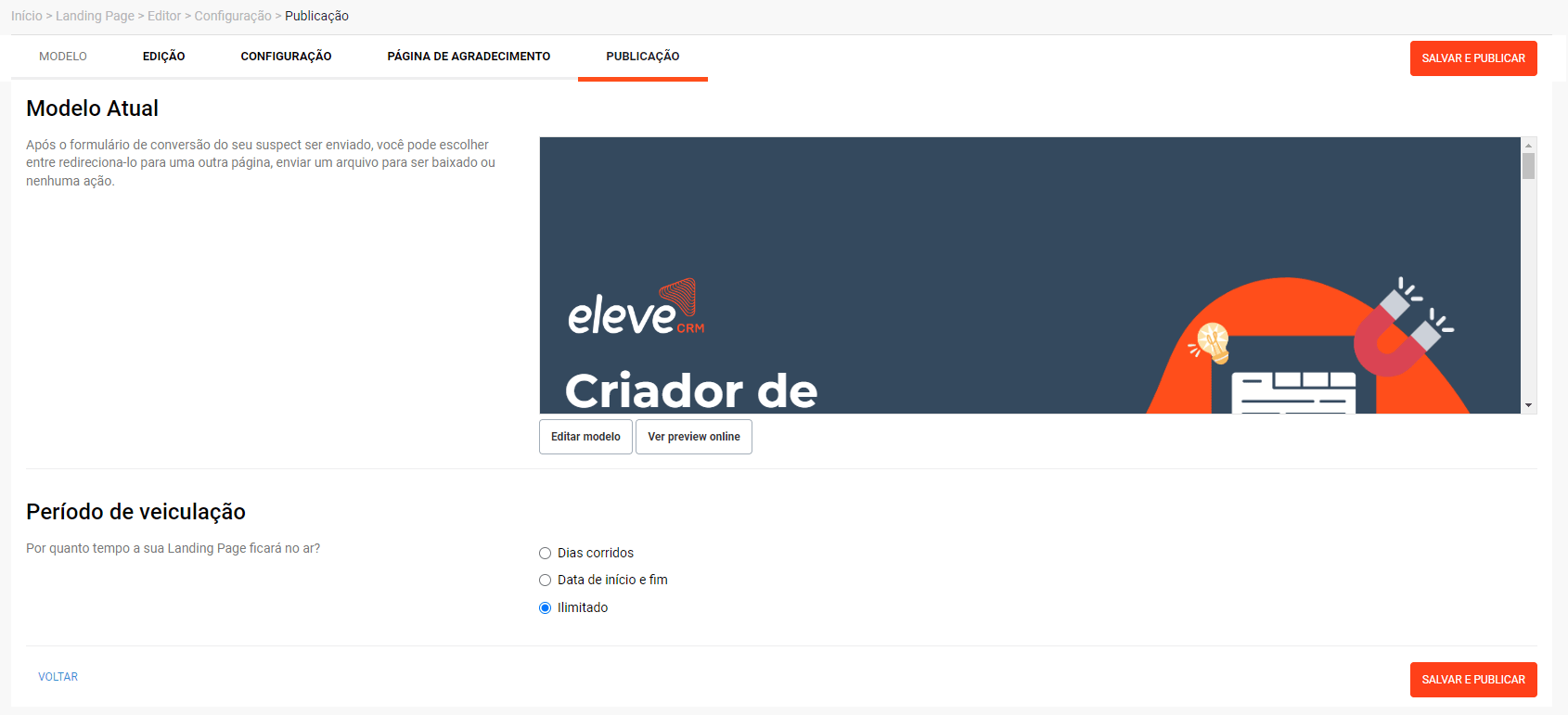 Selecione o período de veiculação (campo obrigatório!), ou seja, por quanto tempo sua landing page ficará no ar. Por fim, basta clicar em ‘’Salvar e Publicar’’ e pronto, sua página estará no ar!