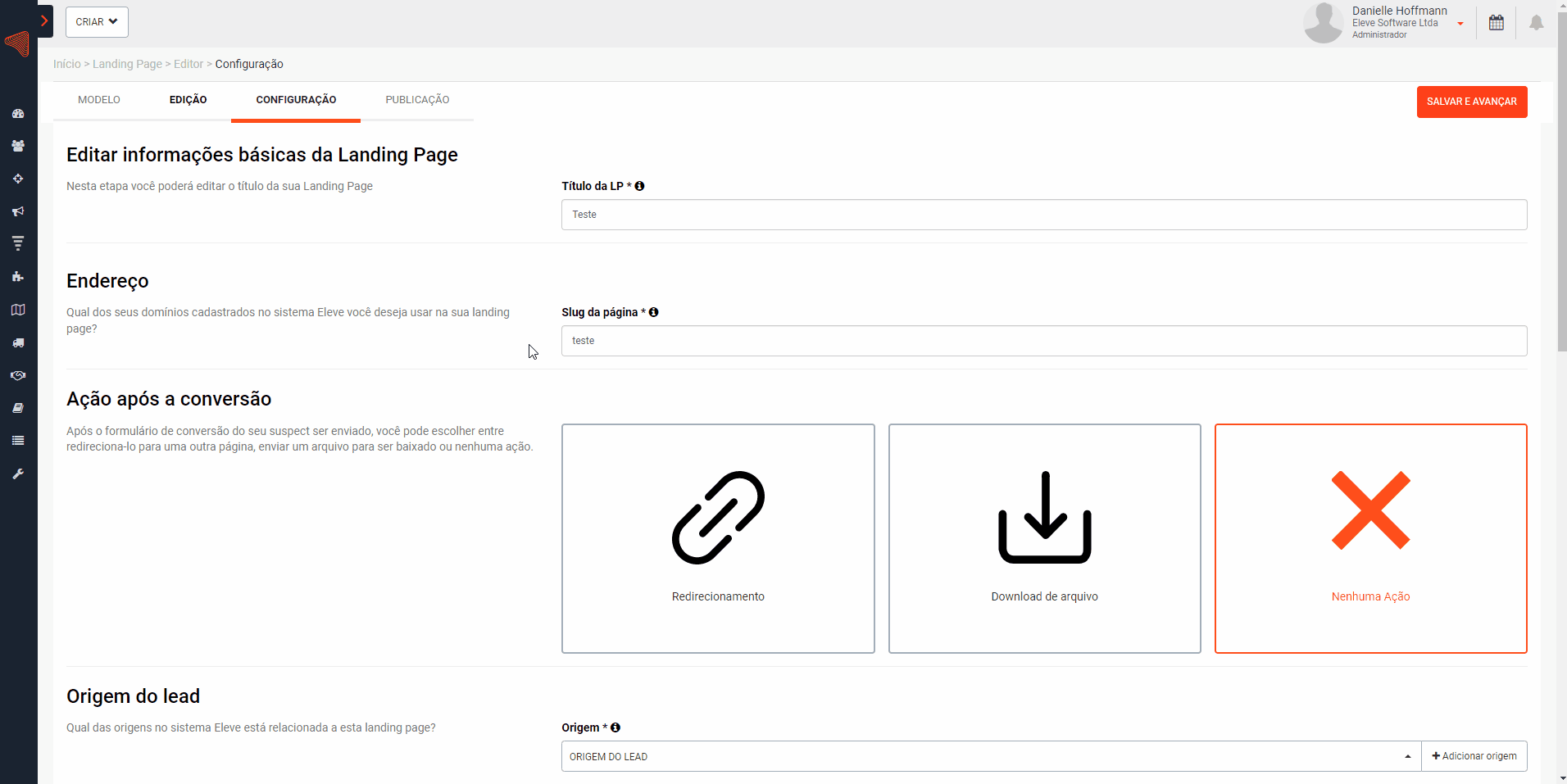 Nessa parte você deve editar as informações básicas da Landing Page como, por exemplo, o título, slug da página, qual ação vai acontecer ao preencher o formulário, etc.