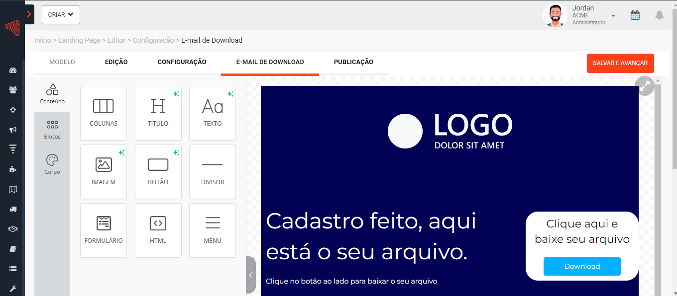 Ao definir como Enviar arquivo por e-mail, uma nova guia de edição irá abrir para você criar sua nova página. O esquema de edição é o mesmo realizado anteriormente para criar a landing page.