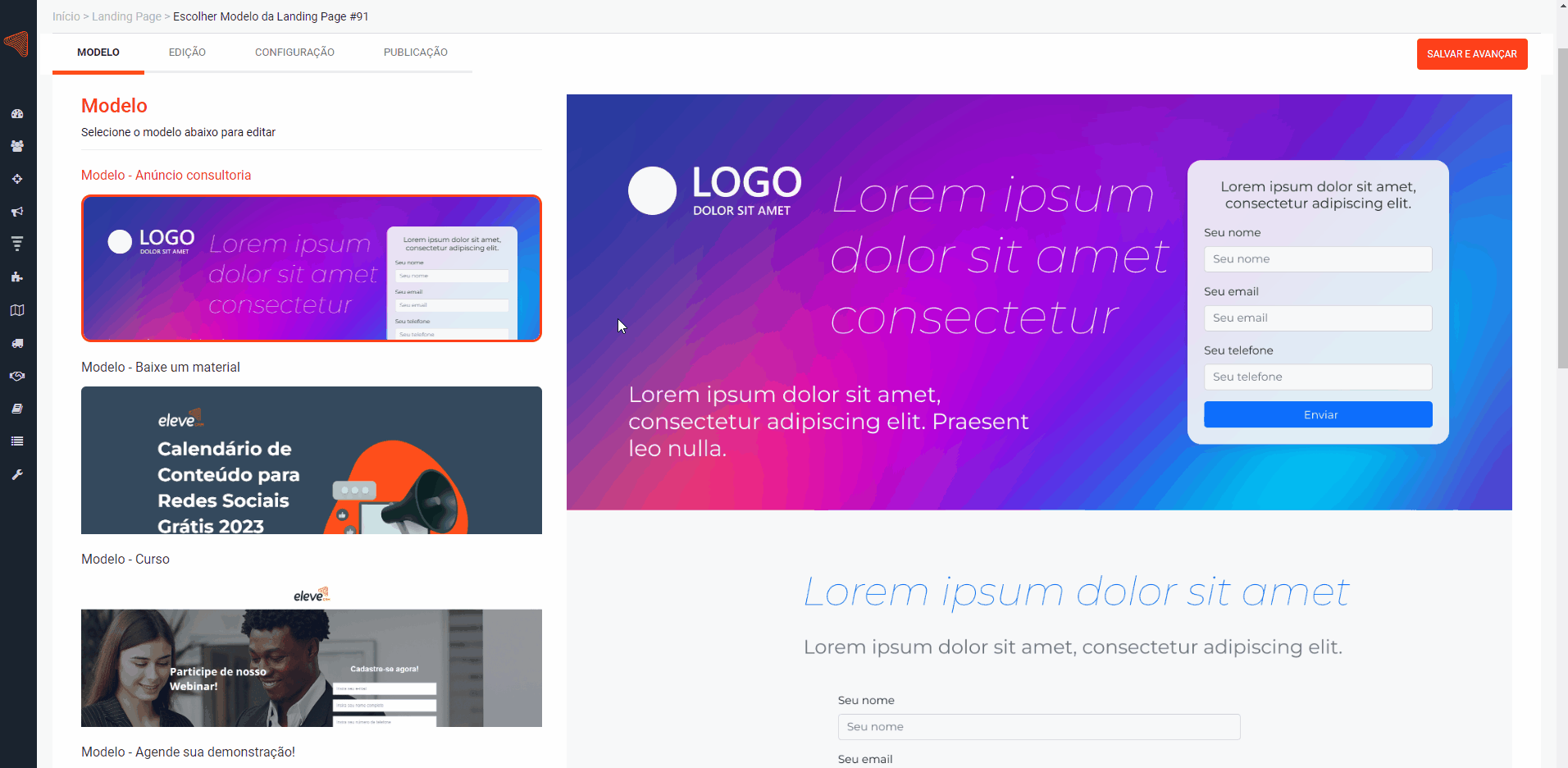 ⚠️ Após escolhido, não será possível alterar o modelo da Landing Page, como forma de você não perder suas edições, caso já tenha começado. Para escolher outro modelo, crie uma nova LP.
